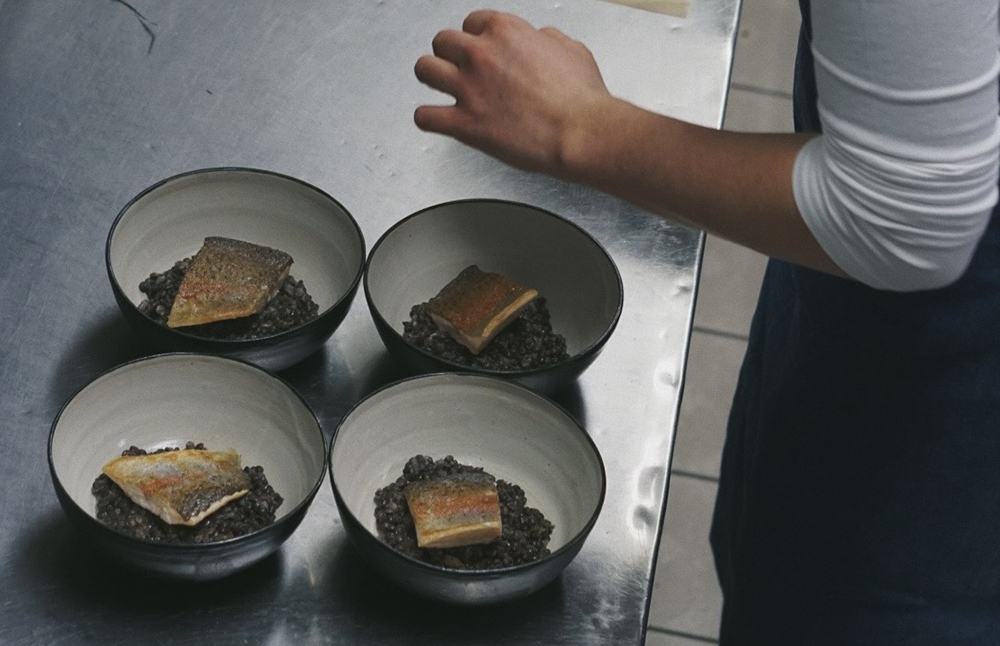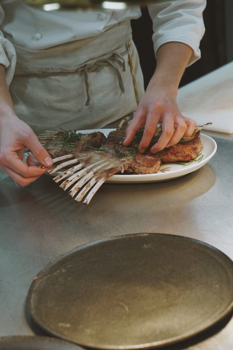 Was die Küche von Johann und Johanna Simmet ausmacht, ist die Verbindung von Bodenständigkeit und Feinsinn: einfache, klare Produkte, die mit Sorgfalt zubereitet werden. Das gilt für das Schaf, für das Rind und überhaupt für alle Lebensmittel. Nichts darf umsonst gewesen sein. Denn in all dem steckt viel Arbeit und Hingabe. Von den Landwirten und auch von uns. Die Tiere leben von Anfang an im Freiland auf 20 Hektar Weidefläche – sehen tun wir sie erst wieder, wenn im Herbst das Gras zu kurz wird.